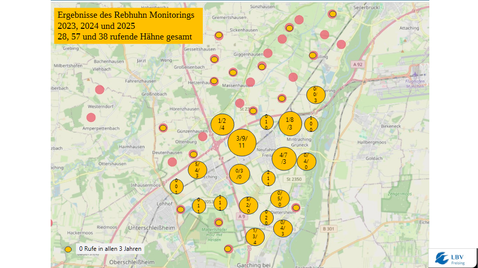 Es zeigte sich ein fundamentaler Unterschied in der Anzahl rufender Hähne zwischen dem Freisinger Moos und dem Biotopverbundgebiet Münchner Norden. Im Süden waren 2023 von 21 Routen zehn mit rufenden Rebhähnen zu verzeichnen (also 48 %), im Norden fand sich auf 19 Routen nur eine mit Nachweis (5 %). Diese Unterschiede konnten auch in den Folgejahren festgestellt werden: