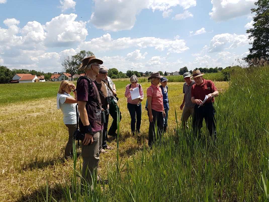 Der LBV besitzt bzw. pachtet rund um Palzing und bei Inkofen einige Flächen, die nicht jeder Aktive der Kreisgruppe kennt. Also haben wir, zehn LBVler unter Führung von Hans Unger (2. Vorsitzender), die Flächen besucht. Südlich der Amper sind es fünf Flurstücke. Die Pflege (Mähen und Abtransport des Grünguts) verhindert das Aufkommen von Gehölzen und senkt den Nährstoffgehalt. Der Graben, der durch die Fläche verläuft, kann Überschwem-mungen verursachen (→ Nährstoffeintrag), sein Wasserstand muss kontrolliert werden. Vor zwei Jahren wurden die Flächen kartiert. Die Anzahl der Pflanzen-Kennarten - sie misst bei VNP Maßnahmen den Erfolg der Pflege - war recht unterschiedlich, der Wert von 4 wurde aber auch auf der am stärksten mit Nährstoffen belasteten Fläche erreicht. Obwohl wir uns stark auf Gelände und Pflanzen konzentrierten, haben wir diese Vögel im Umfeld festgestellt: Rohrschwirl, Rohrweihe, Mäusebussard, Goldammer, Feldlerche, Kuckuck, Dorngrasmücke, Turmfalke, Habicht, Teichrohrsänger, Rohrammer, Feldsperling, Nachtigall.